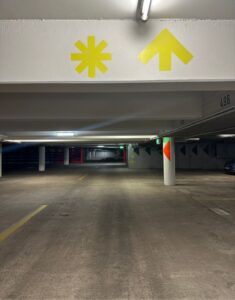 Angekommen in der Tiefgarage fährst du geradeaus, bis du die TRU-Sterne siehst.